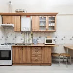 La cocina completa del apartamento dispone de un hervidor eléctrico, nevera y un horno. Para una estancia cómoda y relajante en este alojamiento, los huéspedes pueden disfrutar de servicio de tetera/cafetera. Los restaurantes la Khinkalnya y el MolodoZeleno se encuentran a 5 minutos. La parada de autobús más cercana, Dzherelna, está situada cerca del establecimiento.